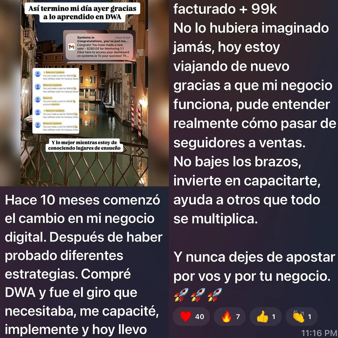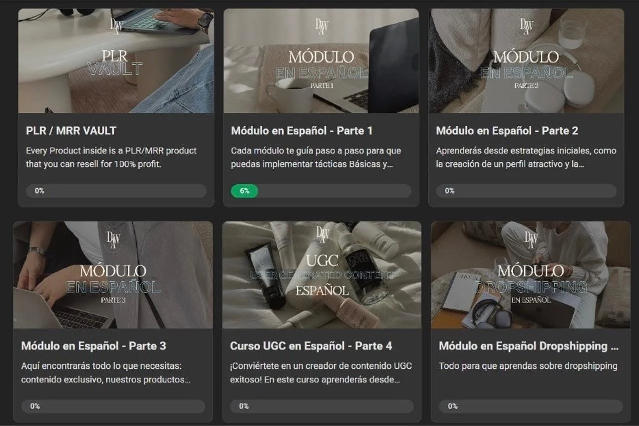 Al unirte a DWA, obtendrás acceso a 7 productos PLR adicionales que podrás revender con un margen de ganancia del 100%. Además, contarás con una Bóveda de Contenido para acceder a nuevo material de marketing y sesiones de capacitación semanales en vivo.